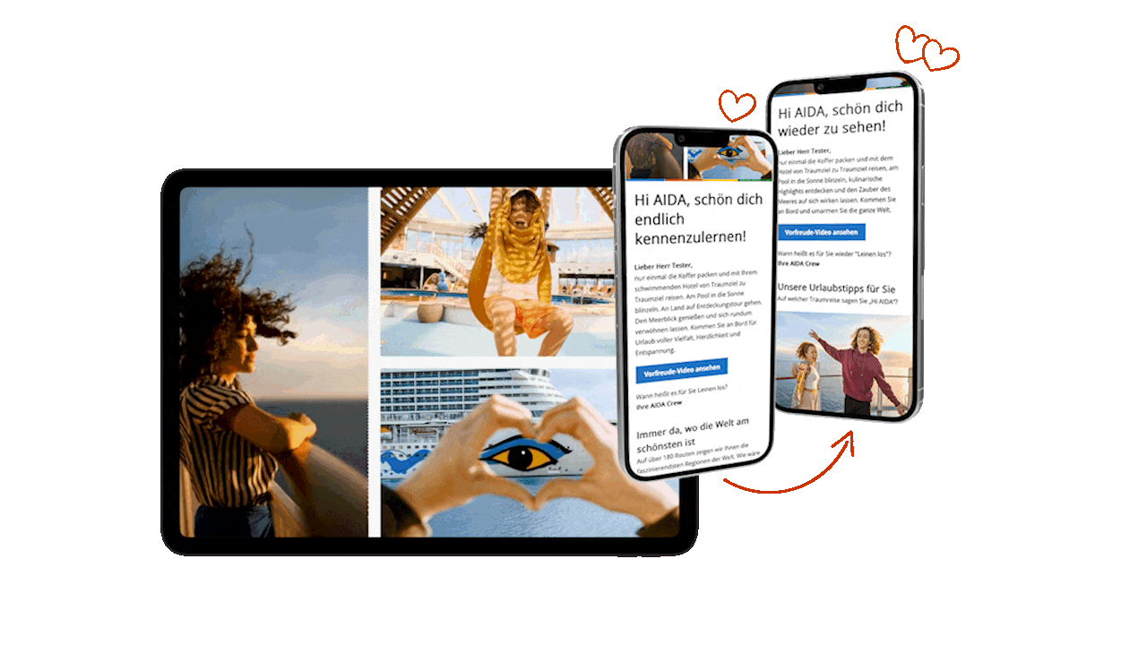 Eine AIDA–Kreuzfahrt ist ein besonderes Erlebnis, keine Frage. An Bord befindet sich die Kundschaft im Urlaub – fernab von Alltagsstress und heimischen Sorgen. Und außerhalb der Komfortzone Schiff? Ist das Unternehmen weiterhin vielen Vorurteilen und Barrieren ausgesetzt, die es abzubauen gilt, möchte man neue Kundengruppen und Fans für seine Marke gewinnen. Dass die E-Mail-Kommunikation dabei nur einen Teil der gesamten Customer Journey darstellt und die Personen von unterschiedlichsten Kanälen und Touchpoints mit unterschiedlichem Wissensstand und Bedürfnissen an die Marke AIDA herangetragen werden, dürfte klar sein. Wo springen sie also aktuell ab und wie kann man sie gezielt ansprechen oder zurückholen? Wie können Bestandskund:innen am Ende einer Reise erneut von einer Buchung überzeugt werden? Und wie können vorhandene Daten auf allen Kanälen bestmöglich genutzt werden?