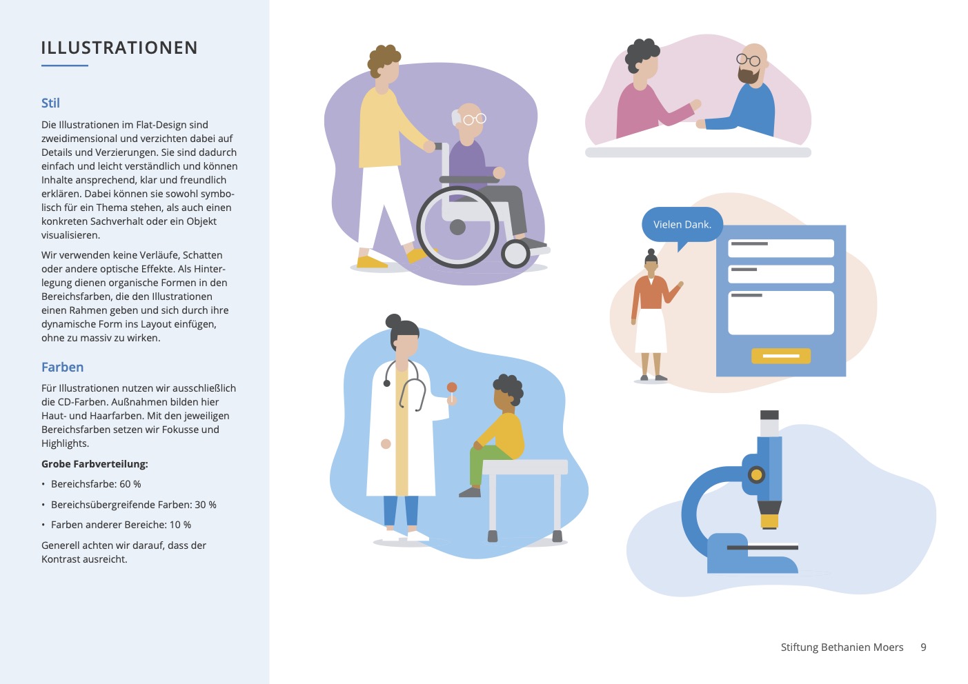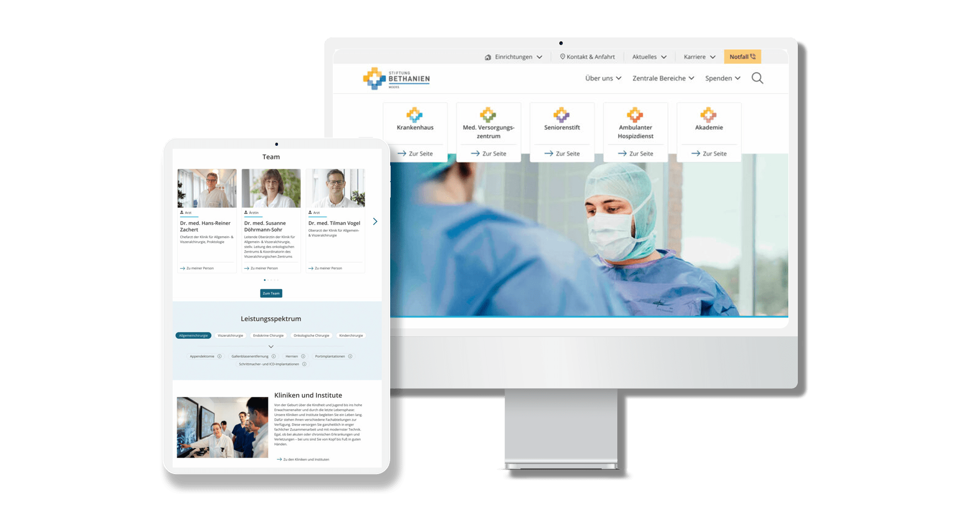 Über viele Jahre hinweg sind die Strukturen der Stiftung Bethanien Moers immer weiter gewachsen und komplexer geworden. Das zeigt unter anderem die Vielzahl der unterschiedlichen Organisationseinheiten. Hinzu kommen verschiedene Zielgruppen mit unterschiedlichsten Anforderungen: Patientinnen und Patienten, Mitarbeitende, Ärztinnen und Ärzte, Partnerinnen und Partner, Bewerbende etc. Gemeinsam führten diese Punkte über die gesamte Marke hinweg zu einem uneinheitlichen Erscheinungsbild sowie einer fehlenden Positionierung und unklaren Botschaften.