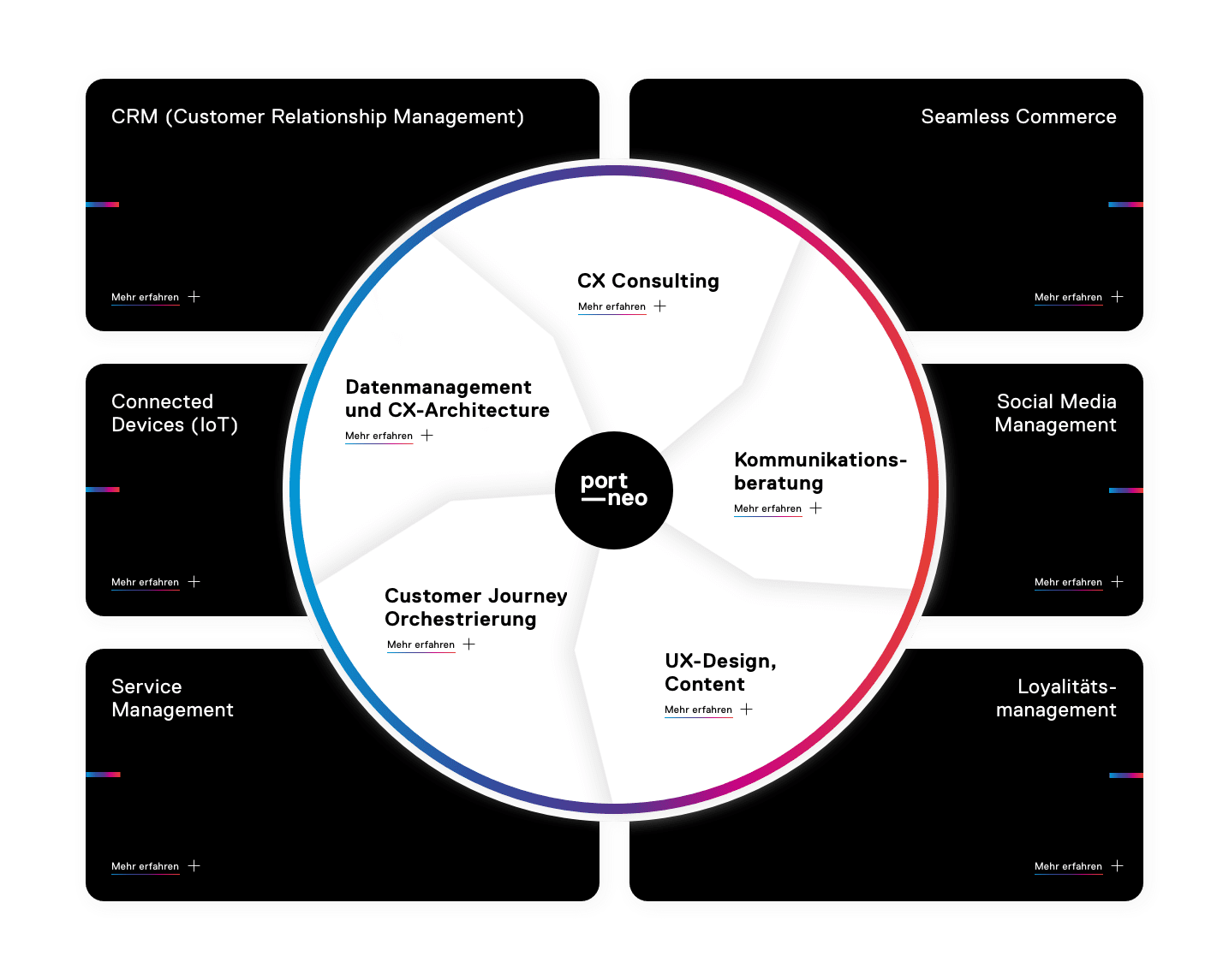 Customer Experience verändert die Beziehung zwischen Unternehmen und Kund:innen gerade grundlegend. Für port-neo ist das nichts Neues: Das besondere Kundenerlebnis ist Teil unserer DNA. Deshalb unterstützen wir Unternehmen mit unseren Leistungen für systematisches CX-Management dabei, ihre Kund:innen zu begeistern – von der Analyse ihrer aktuellen CX über die strategische Ausgestaltung bis zur Ausspielung kreativer Kommunikationsmittel.