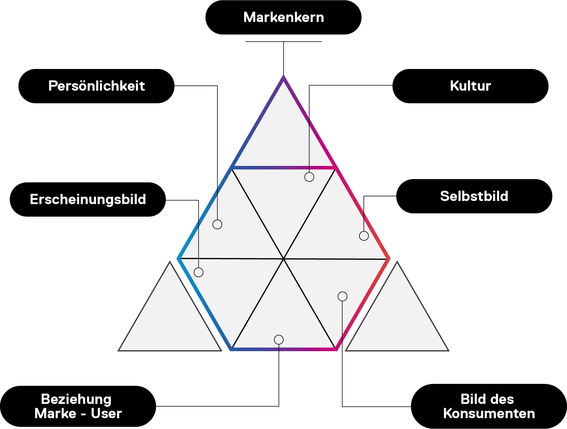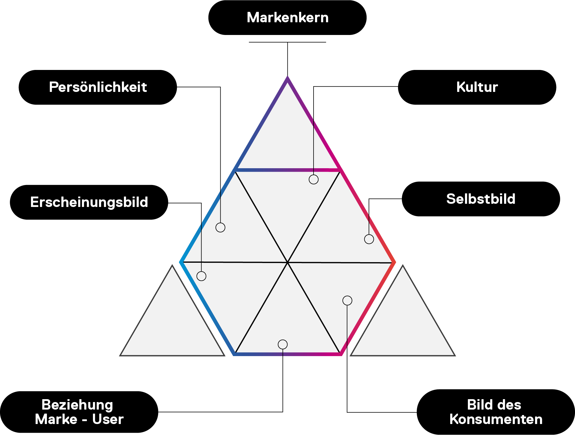 Das Identitätsprisma ist eines der älteren Modelle zur Erfassung der Markenidentität – doch nach wie vor relevant. Besonders seine Mehrdimensionalität spricht unserer Erfahrung nach für sich. Das Modell gliedert sich in drei Hauptebenen: Markenkern, Markenstil und Markenthemen. An der Spitze steht der Markenkern: Dieser ist dauerhaft und unveränderbar und soll mit Blick auf die Markenhistorie und -werte definiert werden. Der Markenstil gibt an, wie die Marke spricht und verleiht ihrer Kultur, Persönlichkeit und ihrem Selbstbild Ausdruck, während die Markenthemen die Art der Beziehung zwischen Marke und Kundschaft beinhalten.