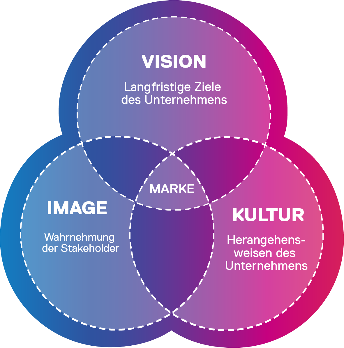 Das Markenpositionierungsmodell basiert auf der Identifizierung und dem Zusammenspiel dreier entscheidender Elemente, die den Markenkern prägen. Erstens: die langfristige Vision des Unternehmens, die seine Ziele, Werte und Ambitionen definiert. Zweitens: das bestehende Image der Stakeholder des Unternehmens, einschließlich der Kundinnen und Kunden, Lieferanten und der Öffentlichkeit – um sicherzustellen, dass die Markenpositionierung authentisch und relevant ist. Und drittens: die Unternehmenskultur, die die Art und Weise beeinflusst, wie Entscheidungen getroffen und Geschäfte abgewickelt werden. Durch die Integration dieser drei Schnittmengen schaffen wir eine starke und differenzierte Markenpositionierung, die die Essenz Ihrer Marke klar und konsistent kommuniziert.