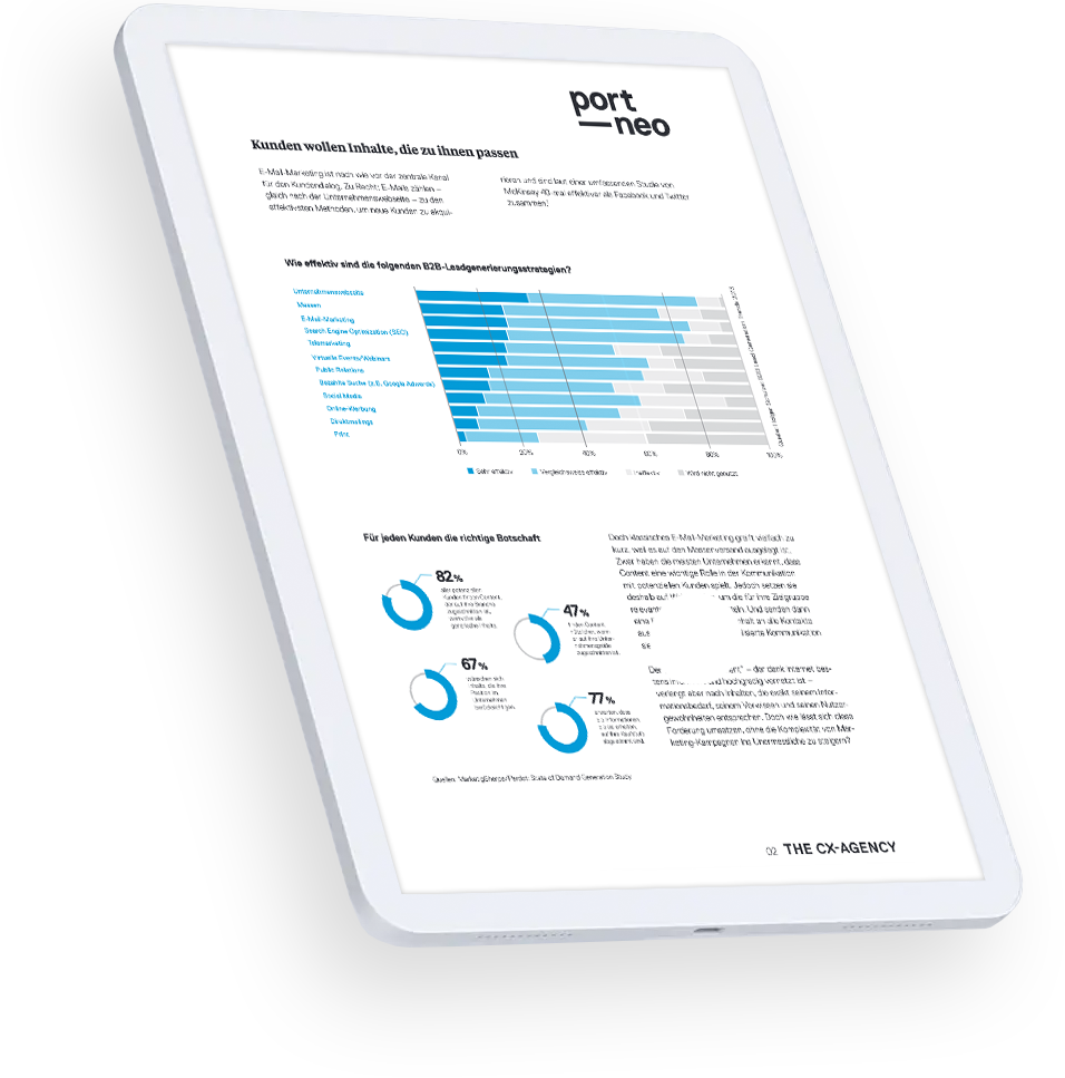 Sie wollen zum richtigen Zeitpunkt mit dem richtigen Angebot beim richtigen Kunden landen? Als E-Mail-Marketing-Beratung mit über 20 Jahren Erfahrung unterstützt port-neo Sie von der Kampagnen-Konzeption bis zur Marketing Automation.