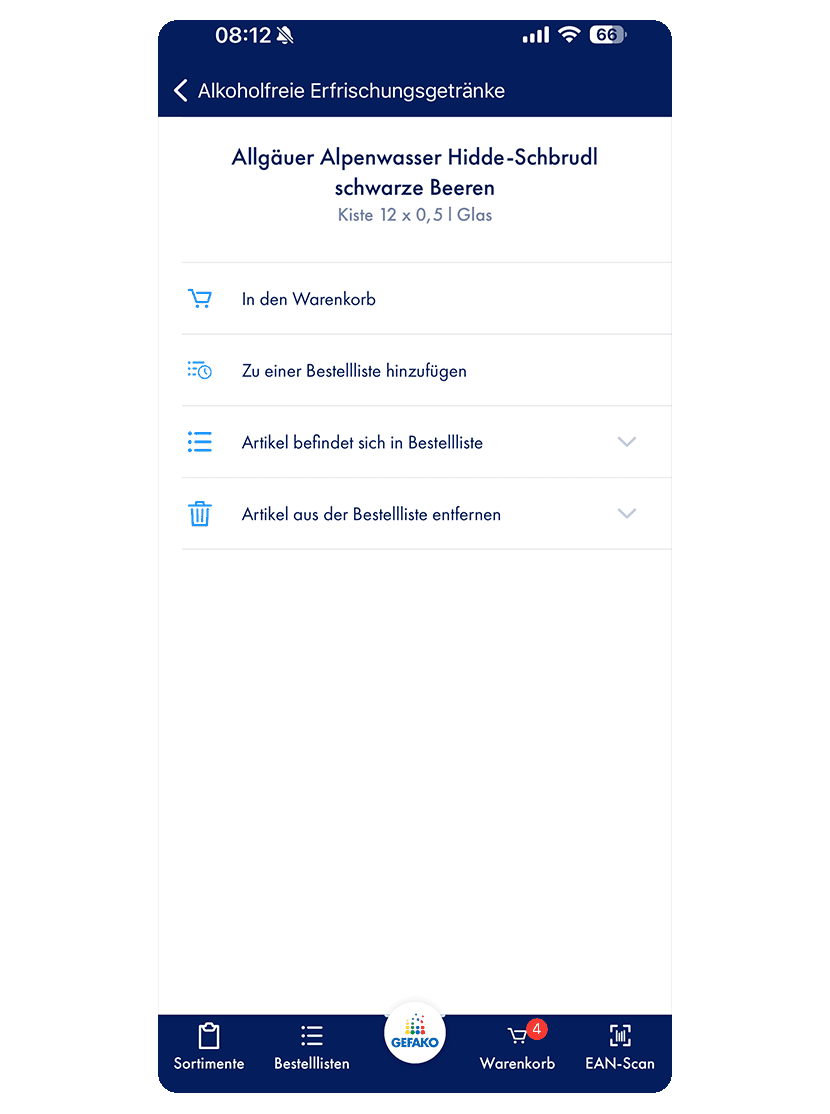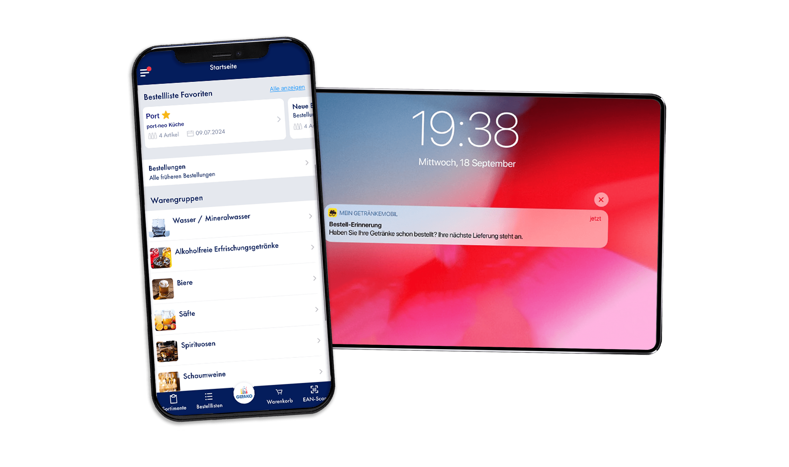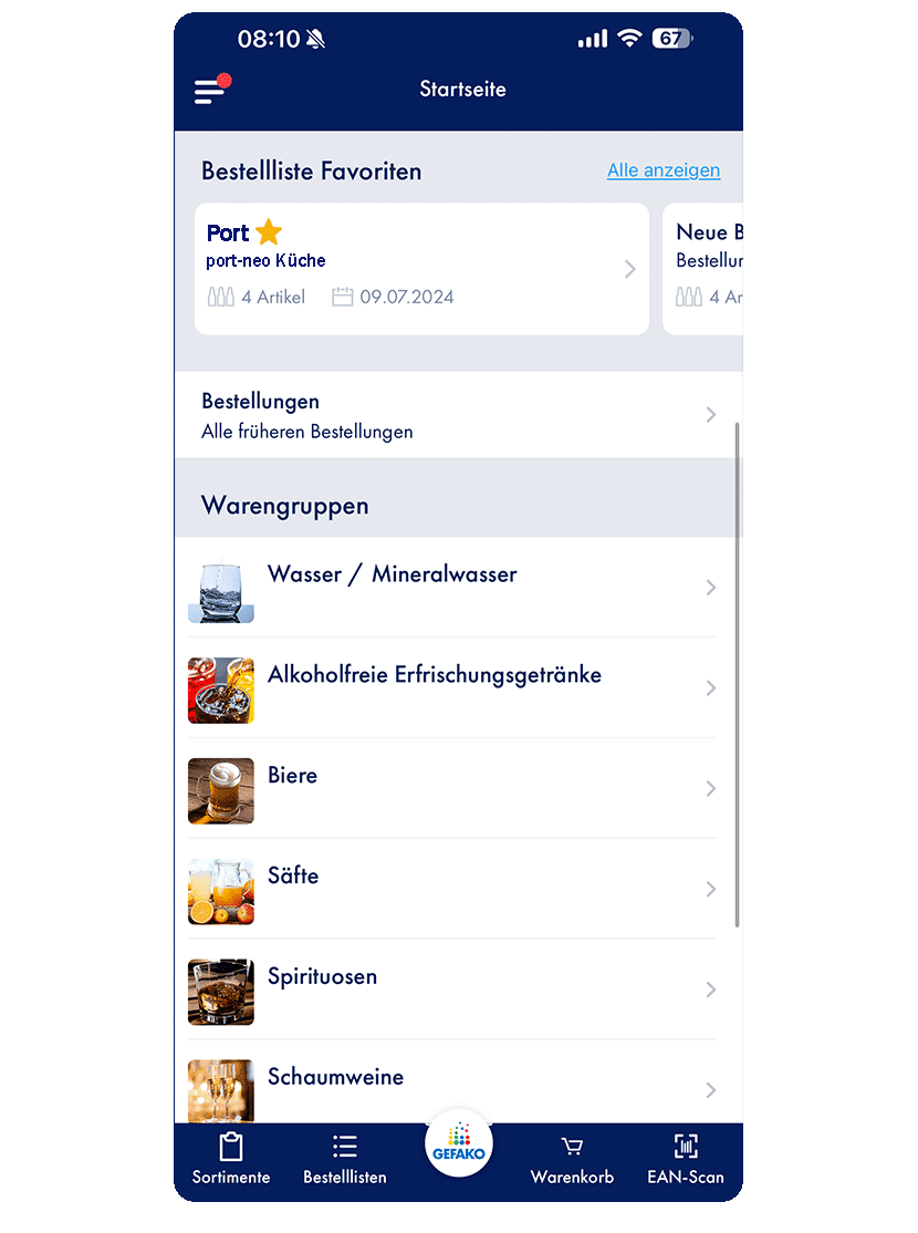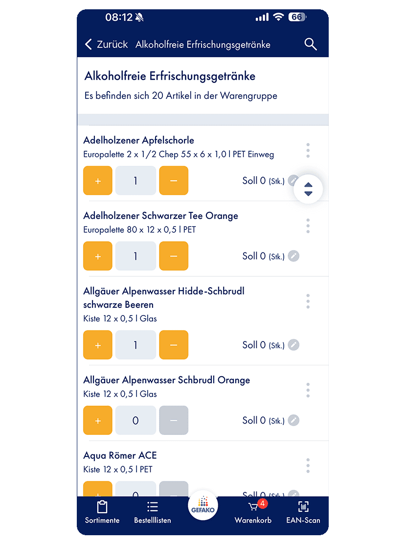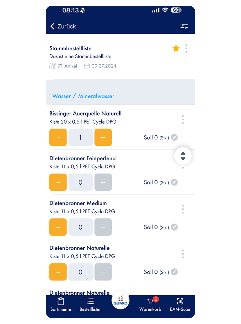 Ohne durch lange Listen scrollen zu müssen, können Getränkebestellungen aus Ihrem Stammsortiment aufgegeben werden – auch offline. Der eingebaute EAN-Scanner hilft dabei, nicht gelistete Getränke beim favorisierten Getränkefachhändler direkt anzufragen.