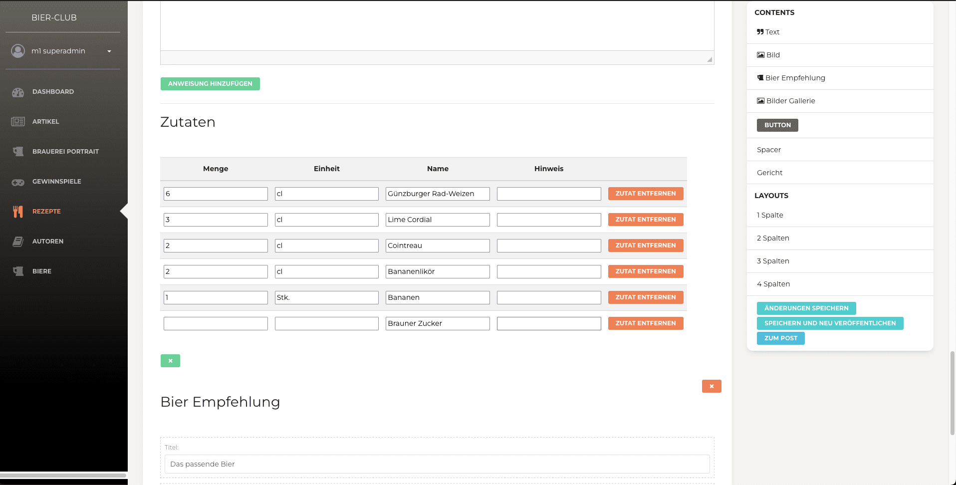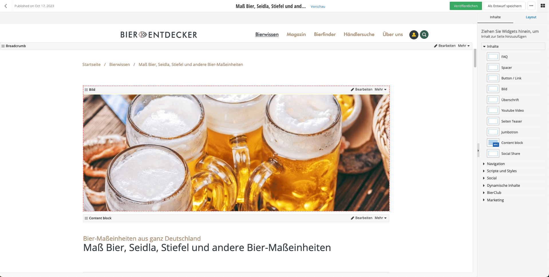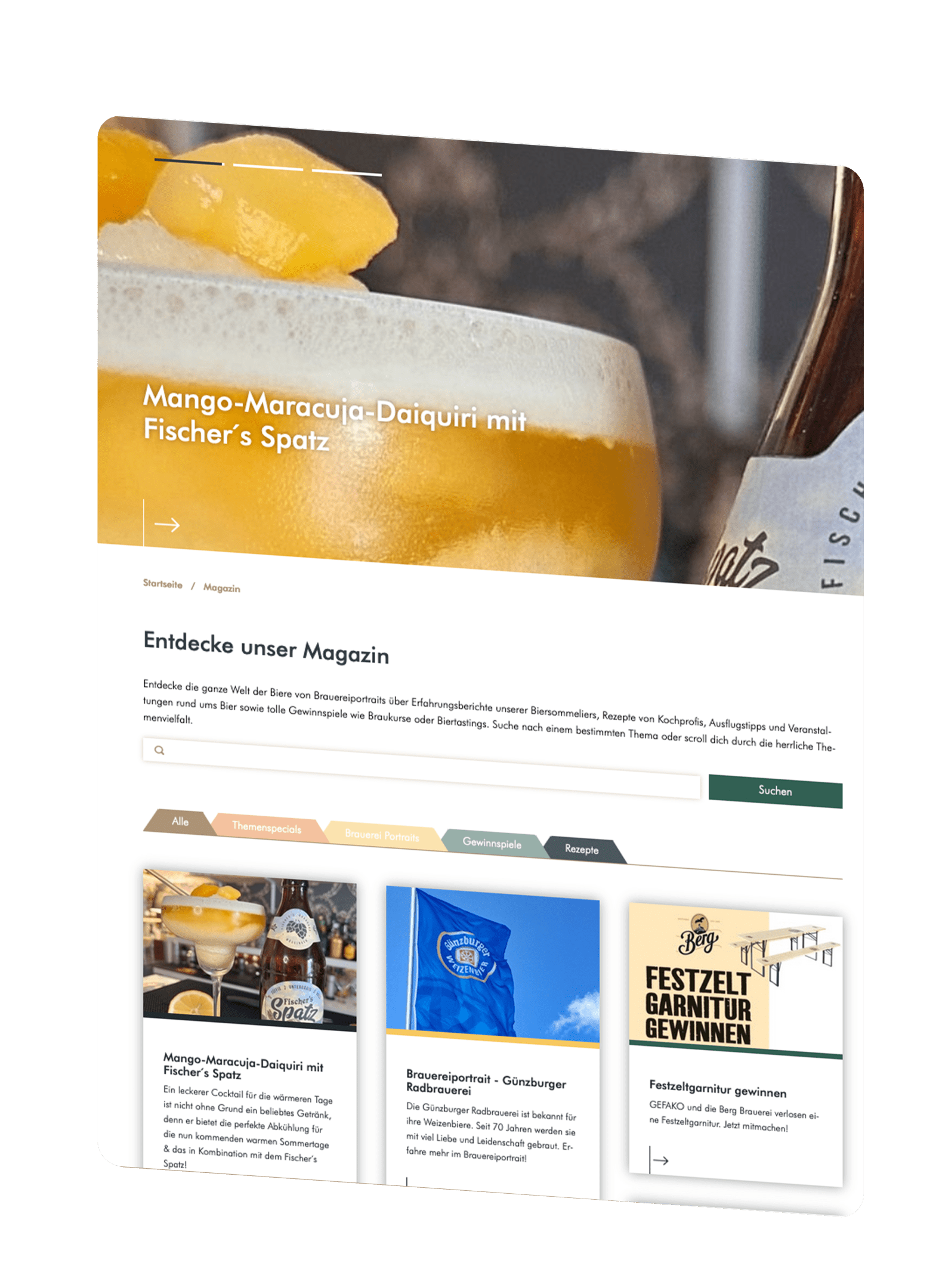Die personalisierte, erweiterte CMS Lösung ermöglicht eine unkomplizierte und schnelle Contentpflege. Zum Beispiel im Magazin-Bereich, in welchem weitere redaktionelle Inhalte, Rezepte, Gewinnspiele ausgespielt werden sowie die Möglichkeit geboten ist, gewünschte Biersorten direkt beim Händler zu reservieren.