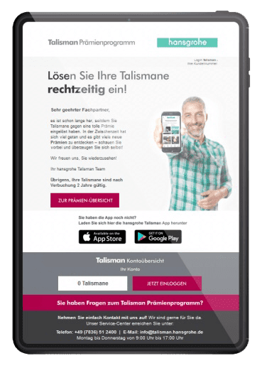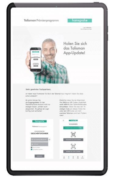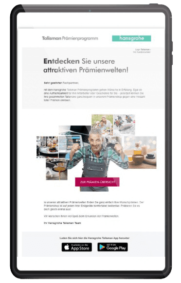 hansgrohe bietet weltweit Premium: Qualität, Design und Innovation. Passend dazu digitalisiert das Unternehmen sein analoges Prämienprogramm „Talisman“. Und schafft so das so etablierte Loyalitätsprogramm der Handwerks- und Sanitätsbranche – mit einer mobilen App, die international ausgerollt wird.