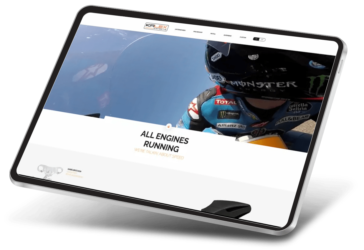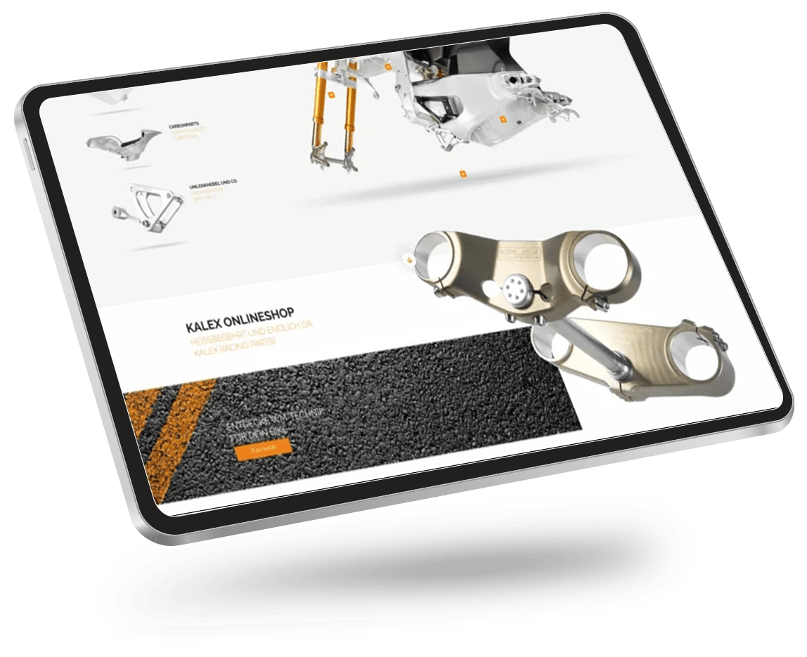 Die neue Internetpräsenz transportiert die Leidenschaft für den Rennsport sowie einen perfekten Anspruch an die eigene Arbeit. Videointegration und animierte Effekte bringen Dynamik und „Wow“-Momente auf die Seite. Große emotionale Fotos transportieren die Gefühle, die KALEX für die eigene Branche hegt. Daneben präsentiert der neue Onlineshop Kleidungsstücke und Custom Parts für Fans der Marke. Damit User sich fließend zwischen Website und Shop bewegen, verzahnt port-neo die beiden und führt das in den sozialen Medien fort.
