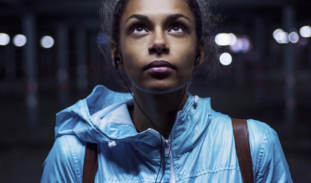 Mann steht auf der Straße und blickt in die Sonne.