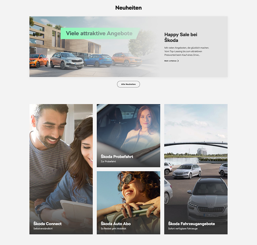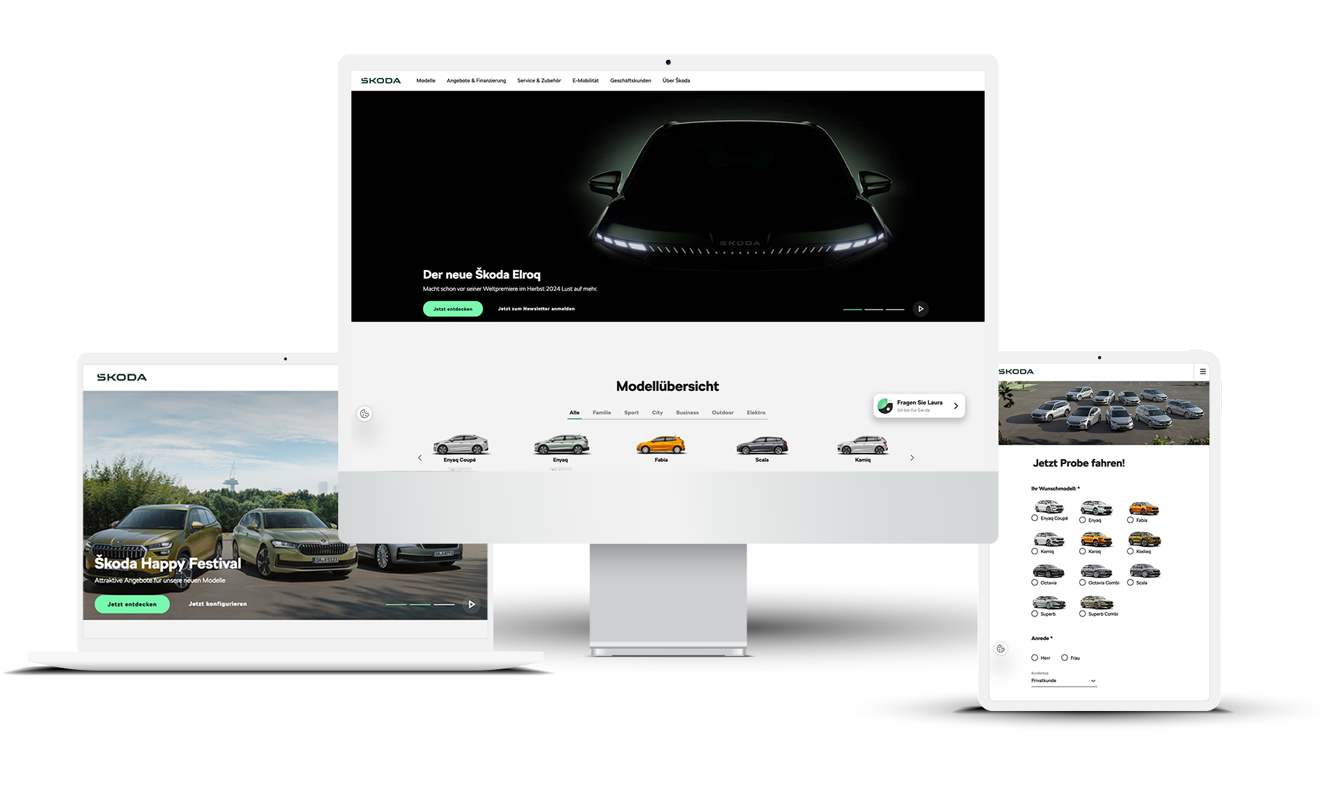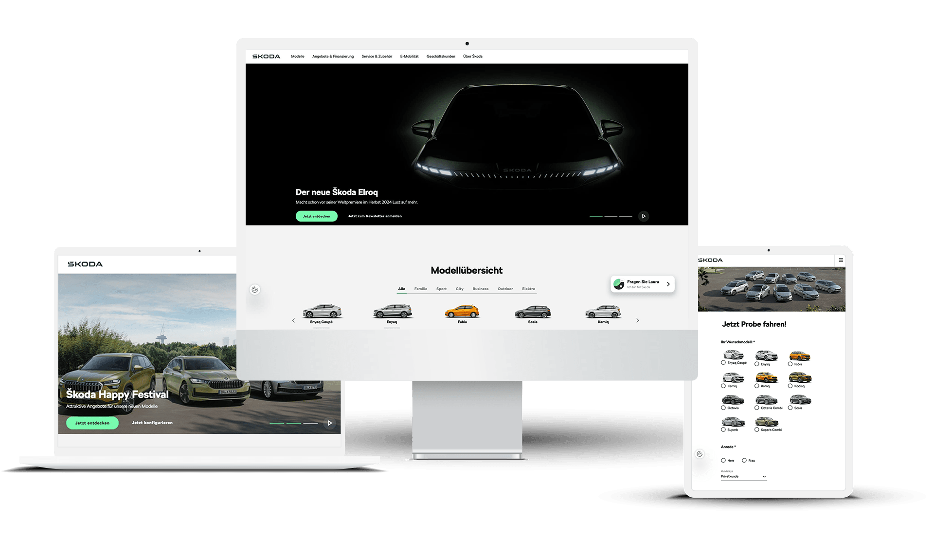 Basierend auf unserer Analyse haben wir UX-Modelle für eine zielgerichtete Nutzerführung und damit die Stärkung des Online-Vertriebs überarbeitet. Auf dieser Basis haben wir rund 200 Unterseiten optimiert, CTAs an den relevanten Stellen gesetzt und die Navigation modifiziert. Wir haben außerdem den gesamten Kommunikationsprozess der Probefahrt (von der Fahrzeugkonfiguration bis hin zur Testfahrt beim Škoda-Händler) digitalisiert – ein wichtiges Instrument der Neukundengewinnung. Im Ergebnis verbinden wir so die digitalen Anforderungen der Kundinnen und Kunden mit den analogen Bedürfnissen, ein neues Auto vorab zu testen.